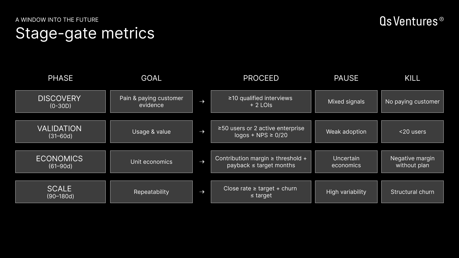 El resultado es una decisión clara: seguir, pausar o parar. Para sostener estas decisiones, las NBUs se organizan en stage-gates, con objetivos y umbrales definidos para cada fase: descubrimiento, validación, economía y escala. Esta estructura protege al portafolio del sesgo del coste hundido y asegura que la inversión sea consistente con los resultados.